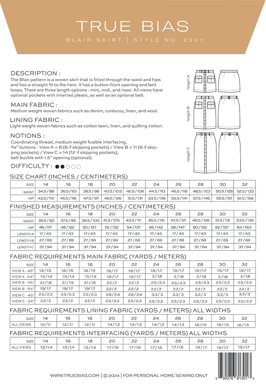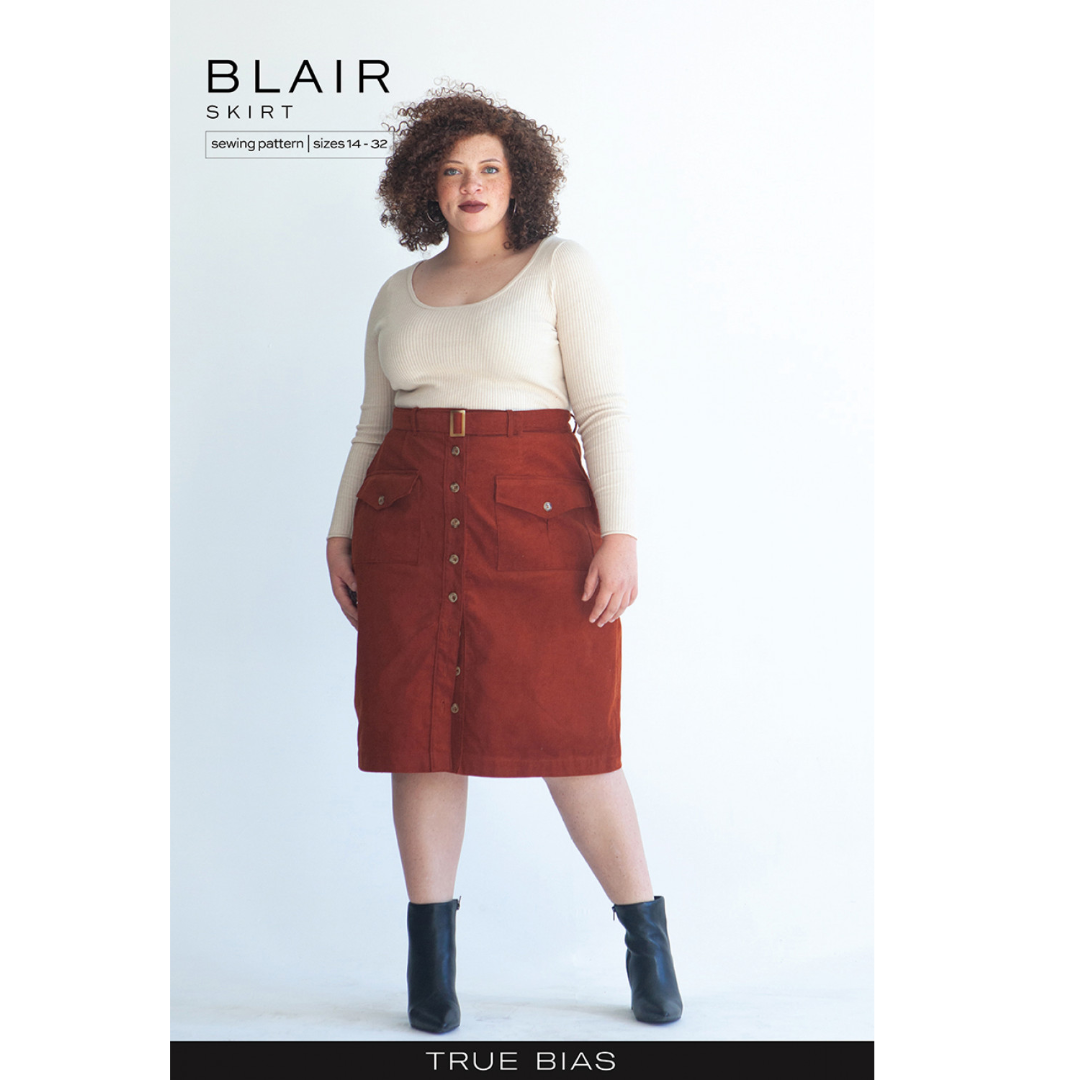 The Blair pattern is a woven skirt that is fitted through the waist and hips and has a straight fit to the hem. It has a button-front opening and belt loops. There are three length options : mini, midi, and maxi. All views have optional pockets with inverted pleats, and a belt.