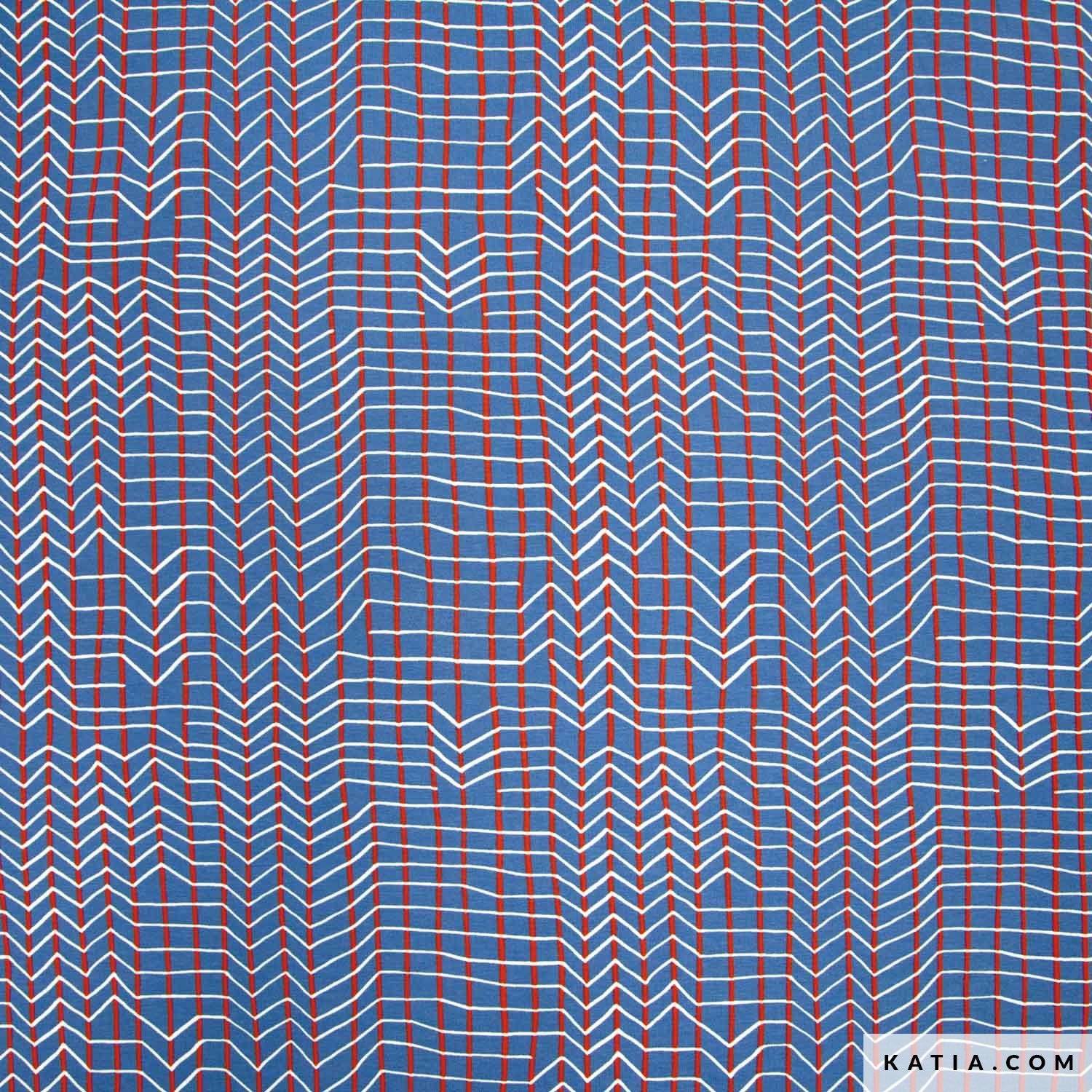 A T-shirt jersey fabric with an original red and white stripe design on a blue background.