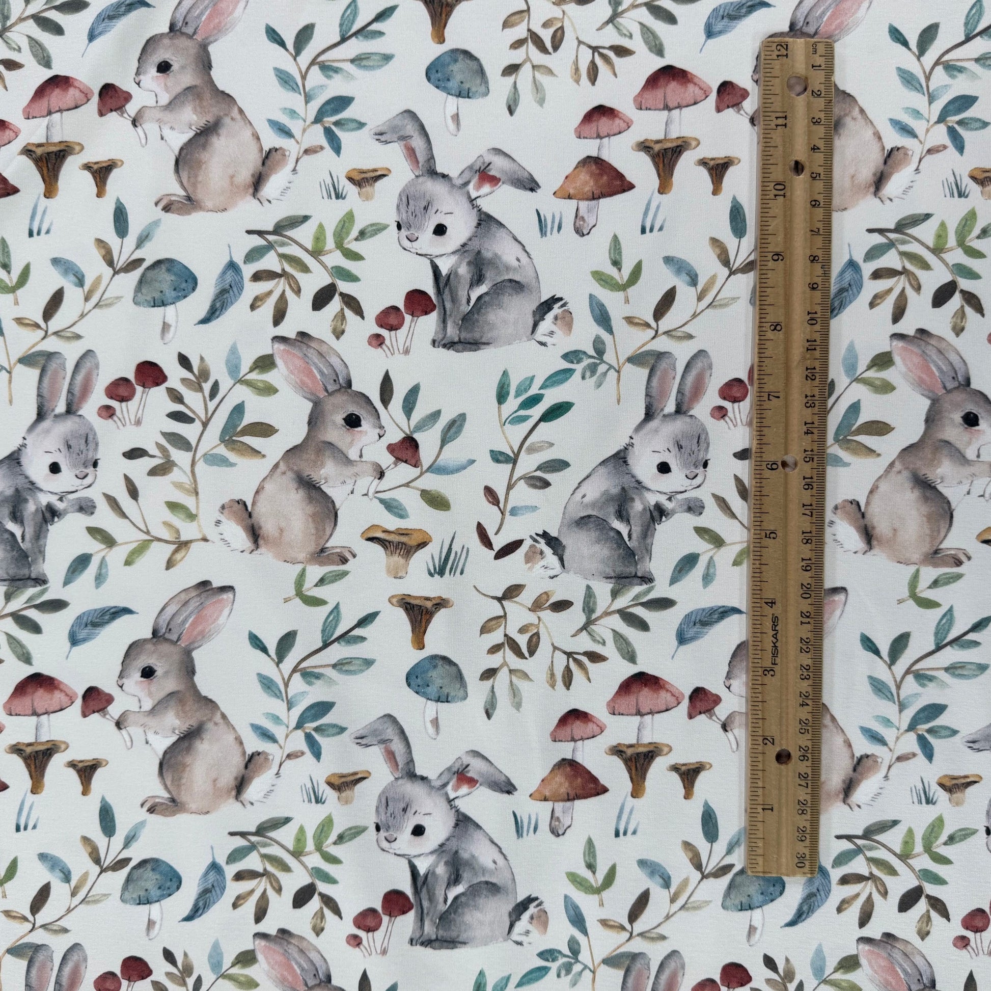 Cute rabbits with foliage and mushrooms.
