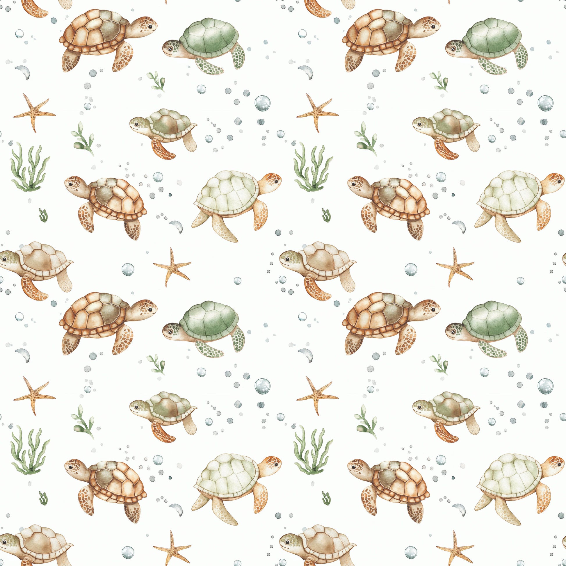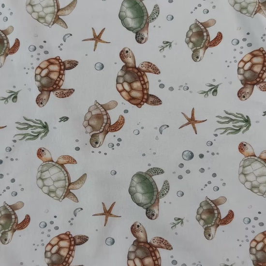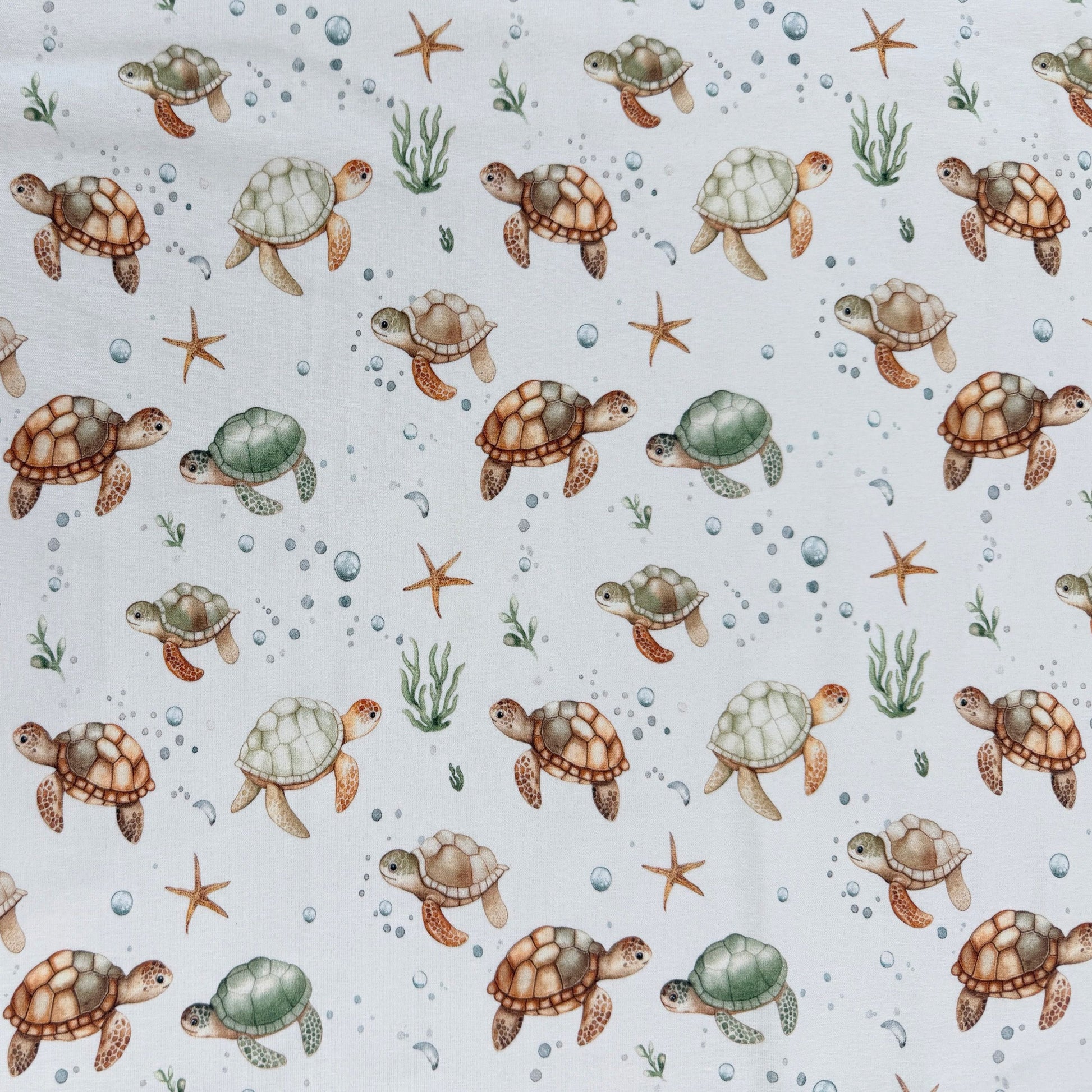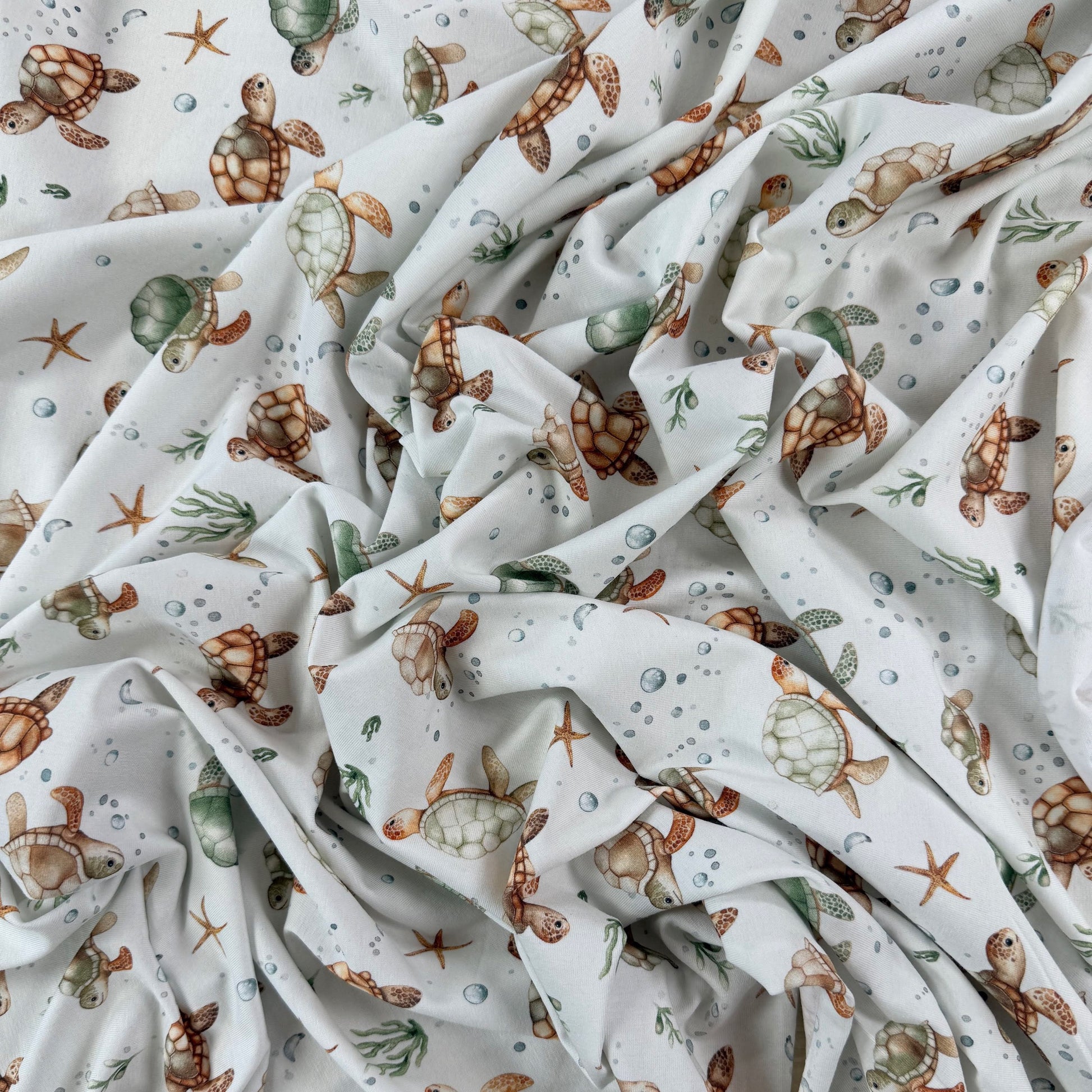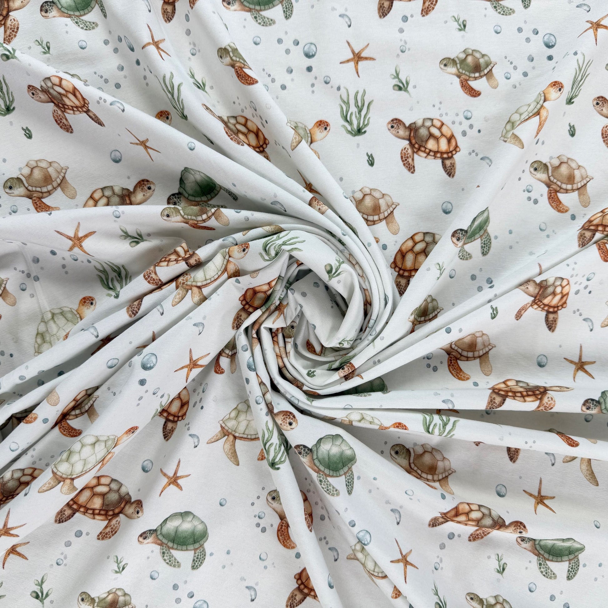 A jersey fabric featuring green and brown sea turtles, seaweed, starfish and bubbles . Soft, comfortable and breathable, this cotton jersey fabric is great for t-shirts, leggings, tank tops and more. Featuring a beautiful custom hand painted watercolour design.