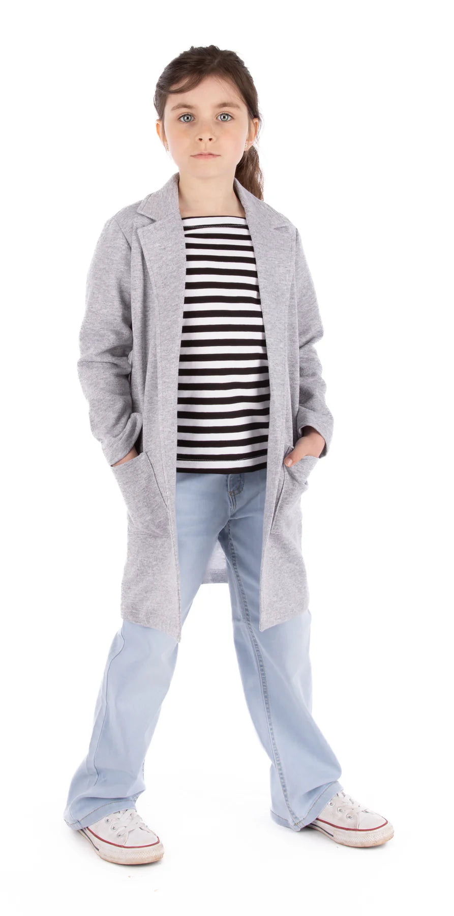 The Pauline pattern for an unlined open-front cardigan with lapel collar and front patch pockets is designed for stable knits. Choose from View A, hip-length, or View B, above the knee.