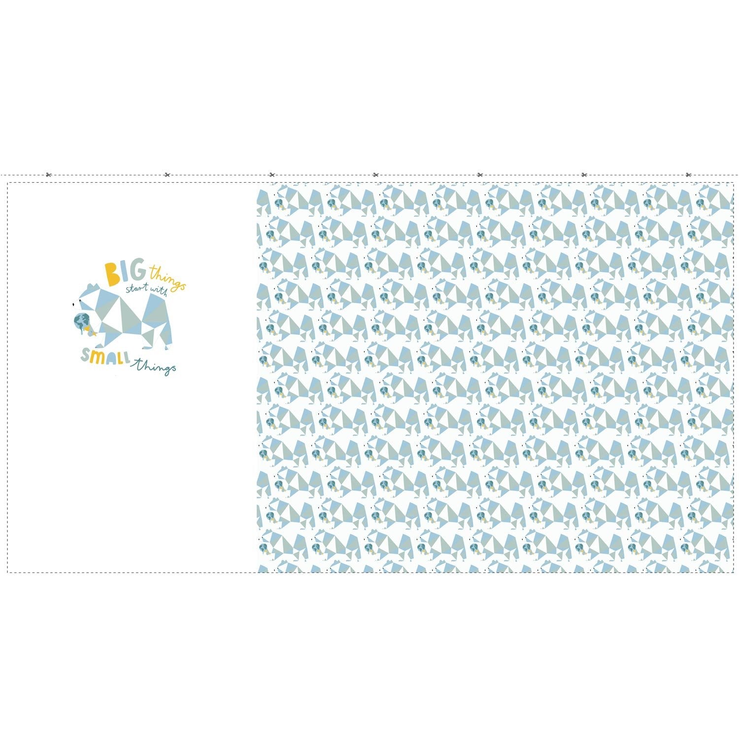 Drawing of a polar bear and the phrase 'Big things start with small things' on the front and coordinating fabric for the sleeves. With this panel you can sew a t.shirt for sizes 12 months to 12 years. A leaflet with photos. showing how to use the panel is included with each panel purchase.