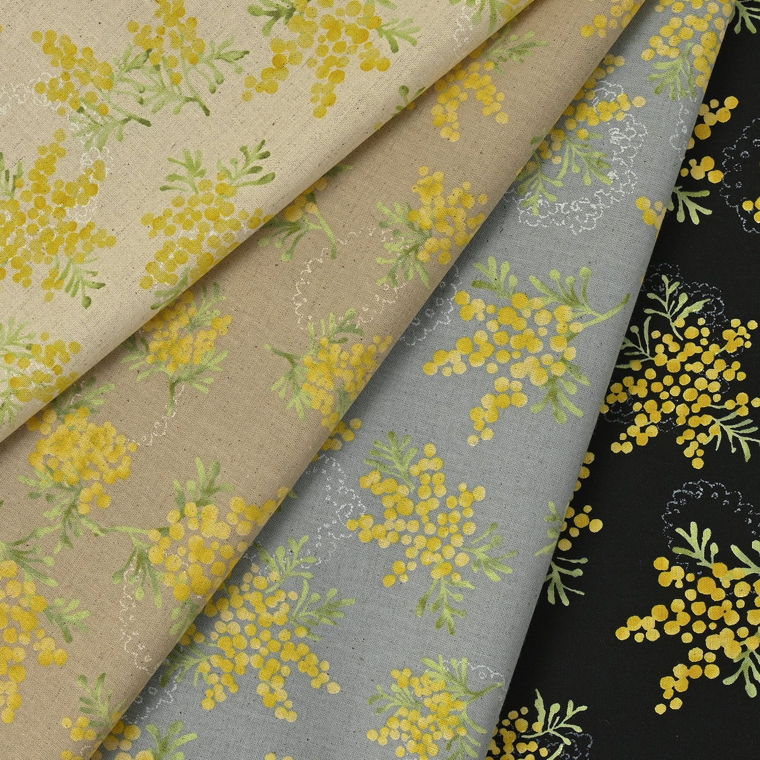 This fabric features a delicate white lace pattern printed in a soft, petite bouquet-like mimosa pattern. The base colour is versatile, and the yellow of the mimosa adds a gorgeous accent.