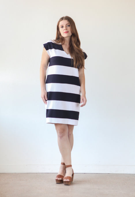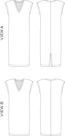The Lodo pattern is an elevated take on a basic t-shirt dress. It has a straight fit through the waist and hips and a slightly tapered hem to create a subtle cocoon shape. It has a flattering deep V neck at center front and an extended cap sleeve. Both the neckline and armholes are finished with a woven facing for stability and structure. View A has a hem that hits at mid calf with a slit at center back for moveability. View B’s hem hits a couple of inches above the knee.