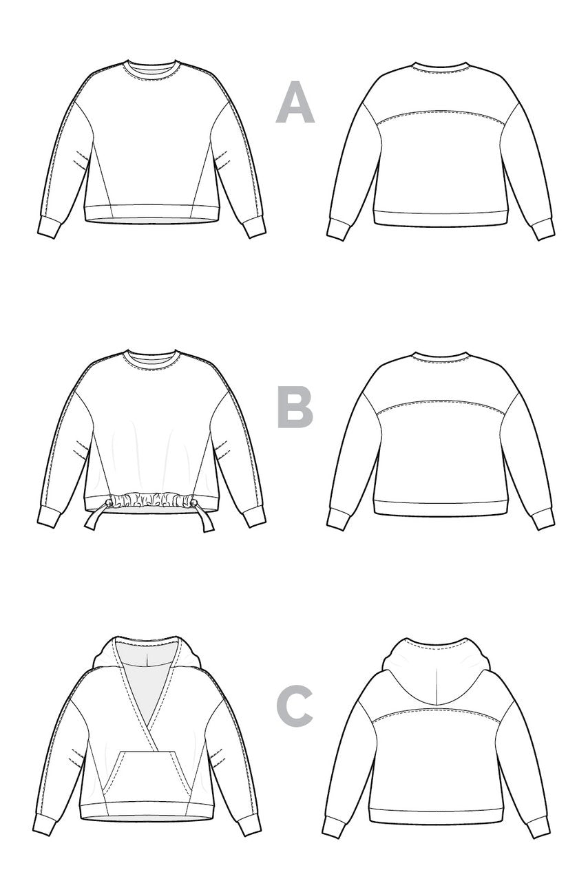 View A is a classic crewneck sweatshirt with a band neckline. View B adds a fun twist by gathering the front band at the waist with a fabric tie. View C is a unique hoodie with a deep crossover neckline and a kangaroo pocket. All views feature a curved back yoke and a two-piece darted sleeve.