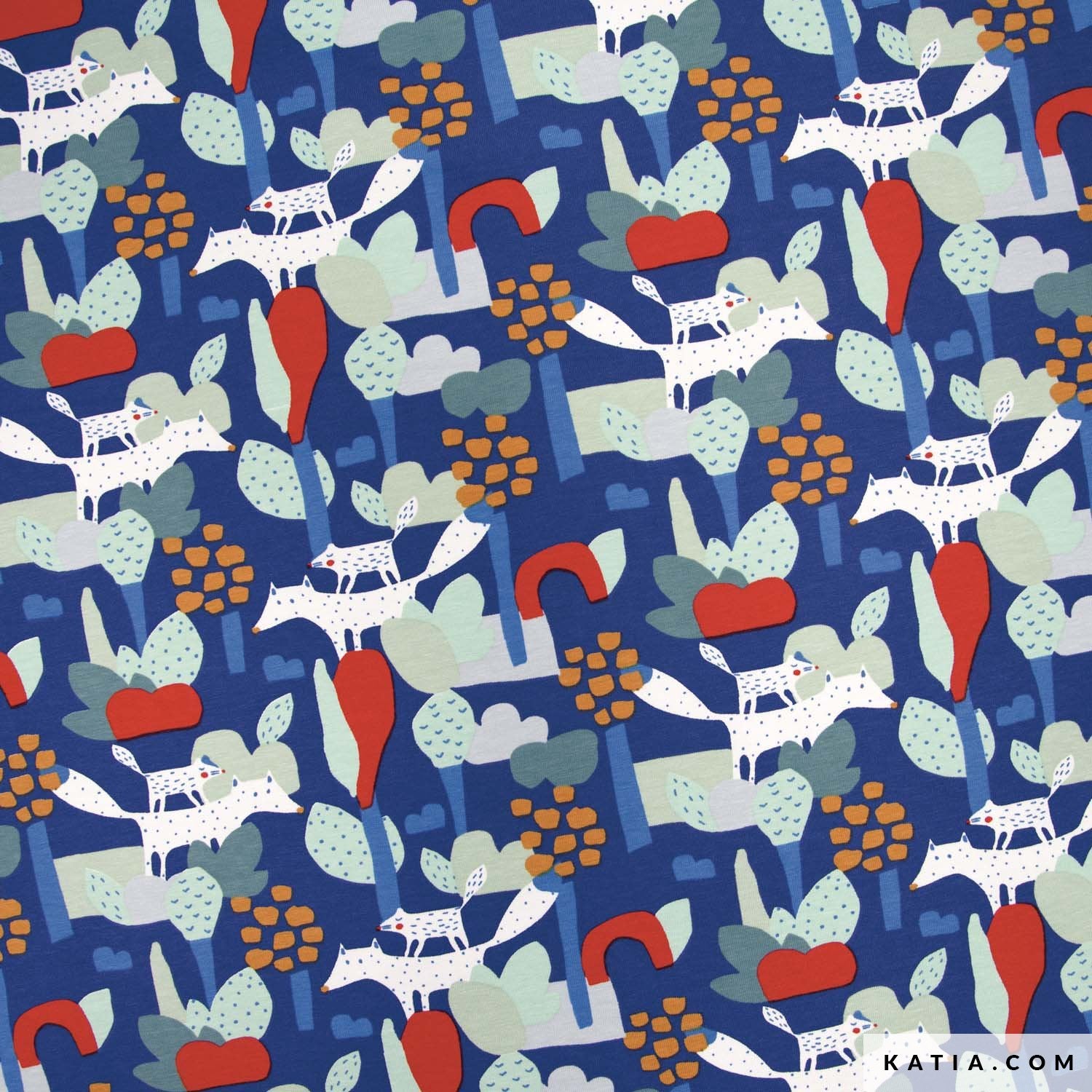 This jersey fabric by Katia Fabrics features a mother wolf and her baby. A winter forest scene on a bright blue background with red and blue trees.