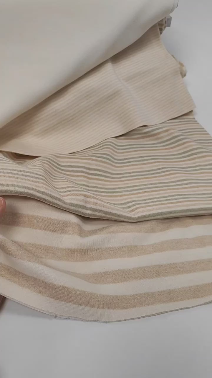 A 100% organic cotton interlock jersey fabric in natural colours like cream, brown and soft green forming minimal stripes. A soft, hypoallergenic and biodegradable fabric that is free of chemicals and ideal for making agreeable and comfortable clothing like bodysuits, t-shirts and rompers.