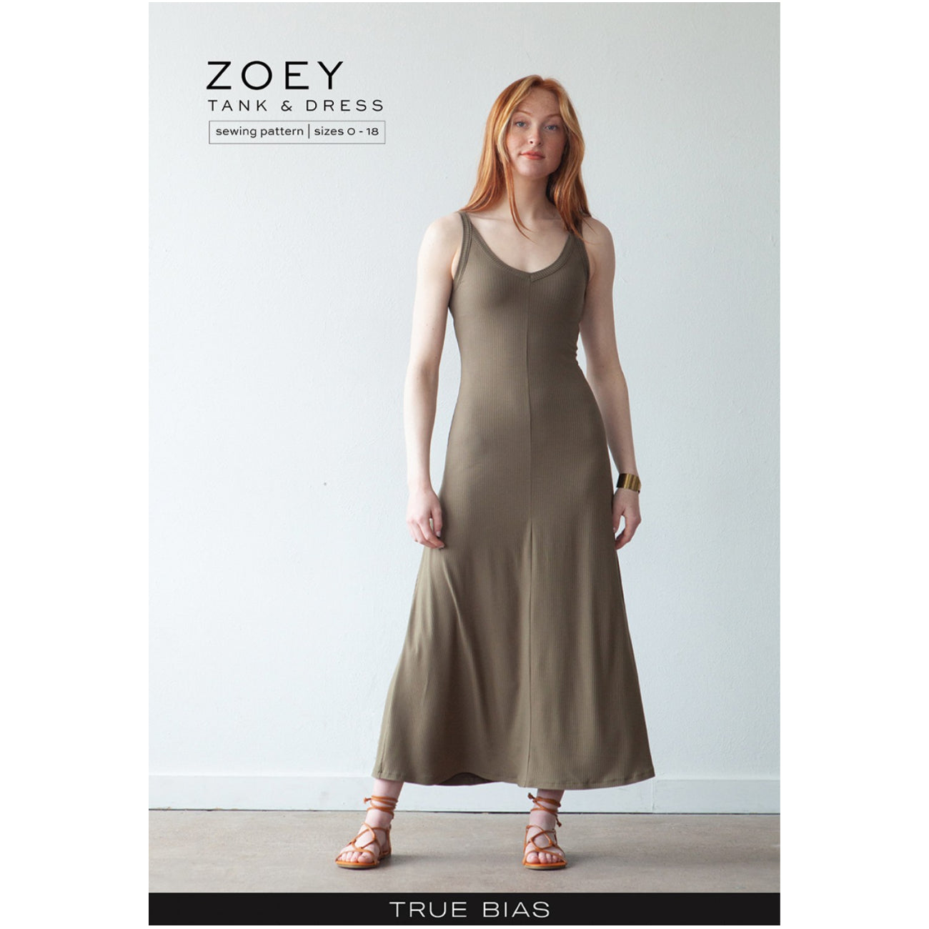 The Zoey pattern is a fitted knit tank top and dress. All views have a soft front V and low scooped back neckline. Armholes and necklines are finished with 5/8” wide bands. Views A and B are tank tops where View A has a cropped length hitting around the natural waist and View B ends around the hipline. View C is a fit and flare tank dress with a center front and back seam for extra shaping and the hem ending a few inches above the ankle.