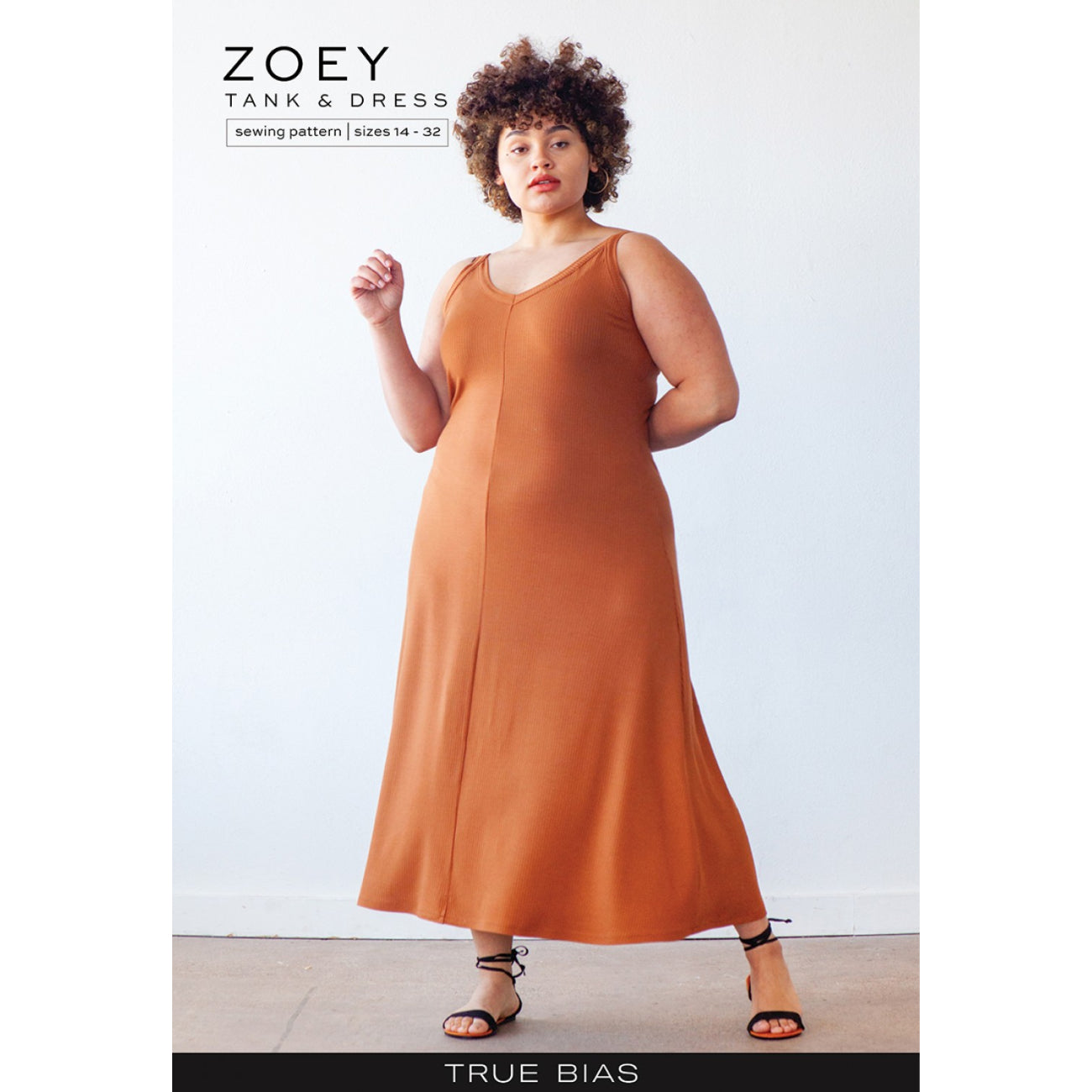 The Zoey pattern is a fitted knit tank top and dress. All views have a soft front V and low scooped back neckline. Armholes and necklines are finished with 5/8” wide bands. Views A and B are tank tops where View A has a cropped length hitting around the natural waist and View B ends around the hipline. View C is a fit and flare tank dress with a center front and back seam for extra shaping and the hem ending a few inches above the ankle.